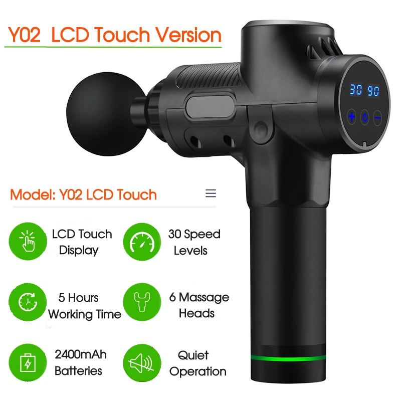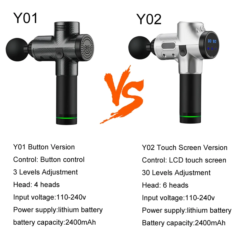 Y01 Button Version Control: Button control 3 Levels Adjustment Head:4 heads Input voltage:110-240v Power supply:lithium battery battery capacity:2400mAh Package included: Y01 Massage Gun+ 4 Massage Heads+ Power Charger+ Carrying Box+ English Manual Y02 Touch Screen Version