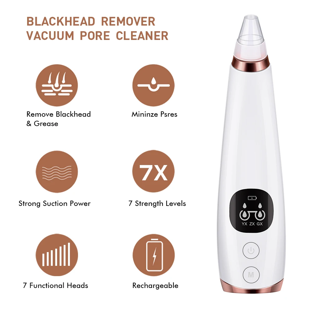 Features1.[Safe & Effective] Adopt innovative upgraded vacuum absorption technology for super strong suction to effortlessly suck out blackhead, whitehead, dead skin, make-up residue, acne and pimple without hurting your skin, non-irritating and painless to avoid side effects.2.[Multipurpose Application] 3 adjustable suction levels and 6 replaceable suction heads for free adjustment, widely suit different skin types and work on different skin areas, fully meet your custom pores cleaning demands. 3.[Easy Operation] One button control, you can conveniently power on/off and switch suction stages, user friendly to operate for instant enjoyment.4.[Clear Indication] High definition LED display provides direct indication of suction levels, remain battery power and working status for real-time monitor to get prepared for the next use.5.[Stable Power Performance] Built-in 380mAh rechargeable polymer battery can be charged by USB charging, you can practically access power supply via PC, tablet computer, adapter, power bank and other USB-enabled devices.6.[Reliable Quality] Ergonomic streamline body and high quality ABS material allow for comfortable holding grips, durable for long time use.7.[Compact Size] Lightweight and portable design, suitable for home and travel use with carrying breeze.SpecificationsMaterial: ABSShell Color: WhiteWorking Voltage: 5VSuction Strength: ≦62KPaCharging Voltage: 5VInput Power: 2.5WRated Voltage: 3.7VBattery Type: 380mAh Rechargeable Polymer BatteryPower Supply: USB ChargingCharging Time: about 90minPackage Included:1* Vacuum Electric Blackhead Remover Cleaner(Main Unit)6* Replaceable Suction Head1* USB Cable1* User Manual