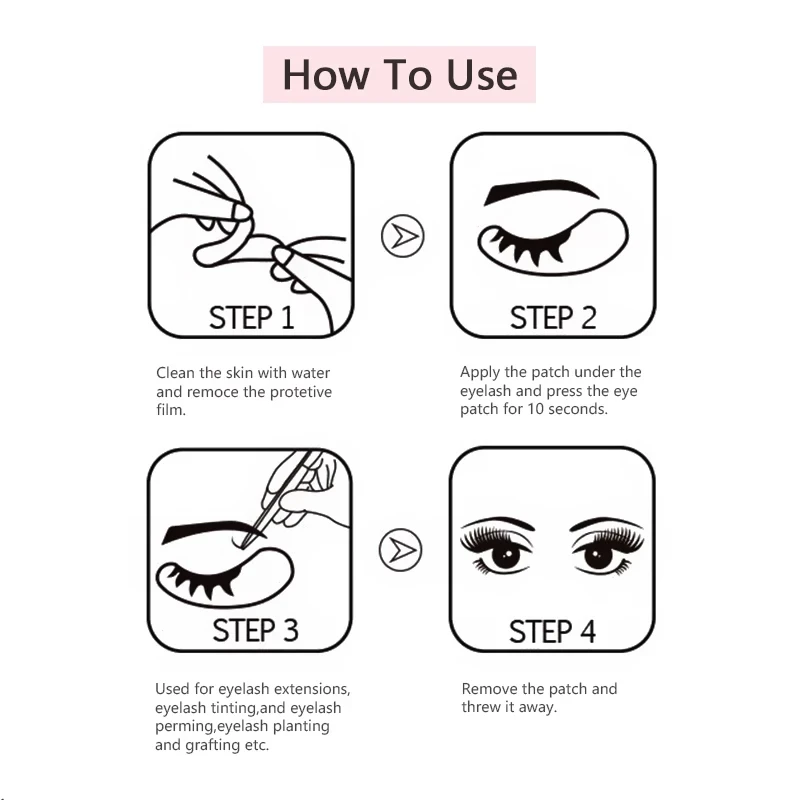 1. Thoroughly clean and dry your face2. Remove the patch from plastic liner3. Apply the patch under eyes during eyelash4. Remove the patch slowly from the edgesNote: